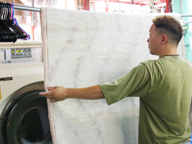 当店の毛布クリーニングは予洗いにて目立つ汚れを事前に落とします。その後、40度の温水にて汚れ・除菌・臭いを落とします。また、当店は乾燥時に自然乾燥を行った後、乾燥機でしっかりと乾燥するので、ふんわりした仕上がりにもなります。